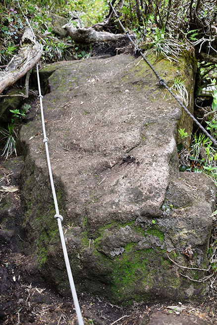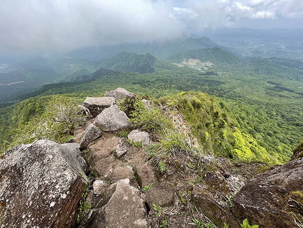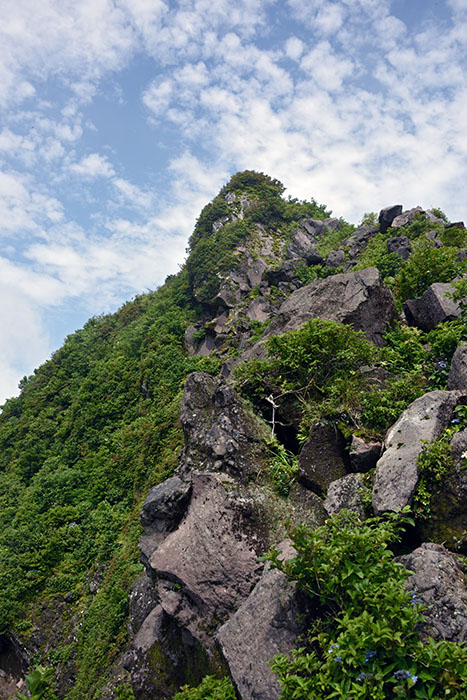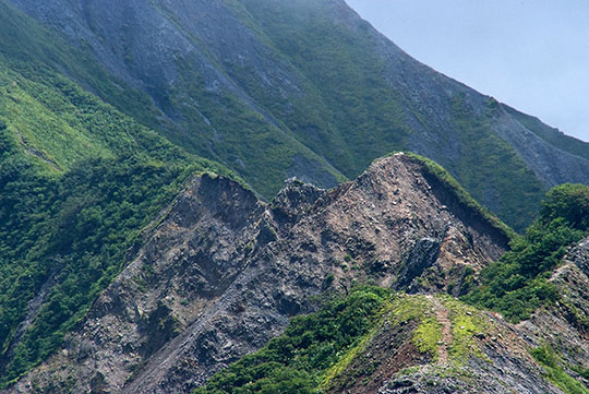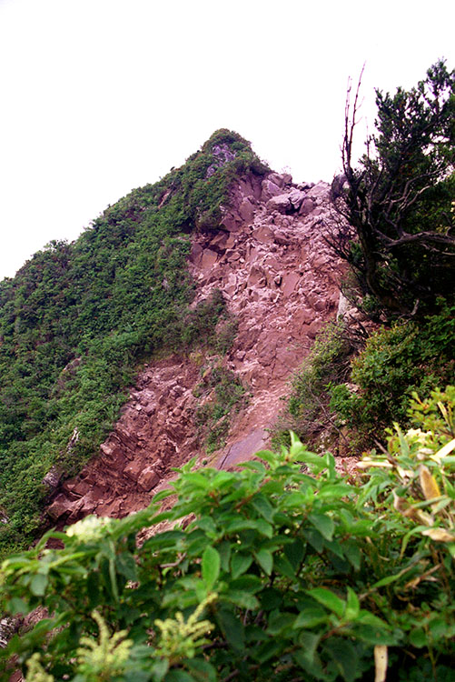 2014年7月27日に撮った烏ヶ山の崩落現場。茶色かった岩場は、グレー色になっています。登山する人が少ないので、登山道はかなりの藪こぎになっています。濡れていると、土も岩も氷のようにつるつるに滑りますよ。
