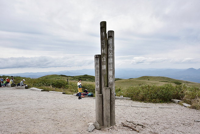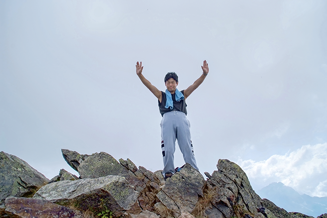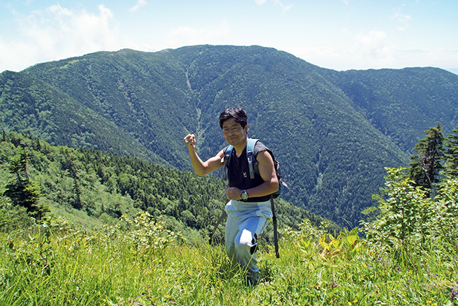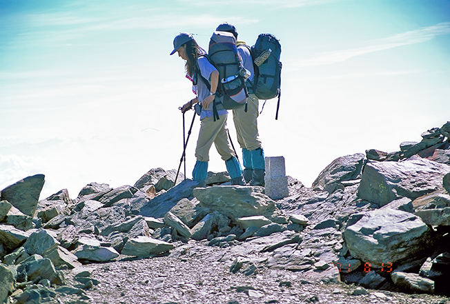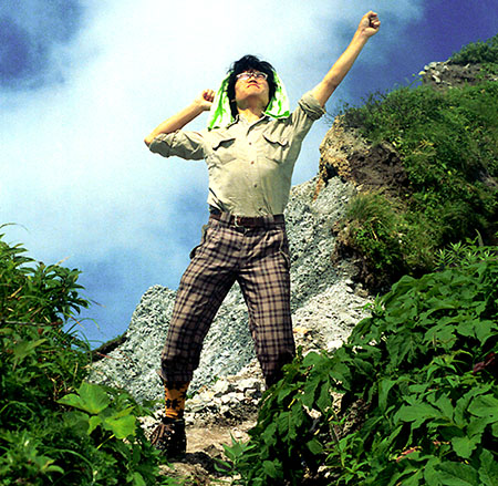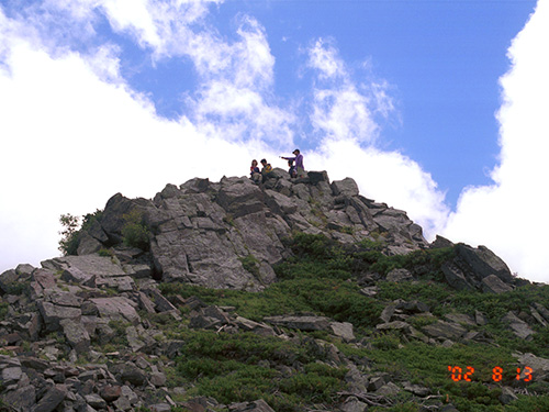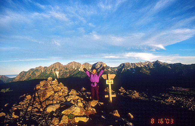 2003年8月、蝶ヶ岳山頂にて。このフィルムがちょっとコントラストと彩度が高すぎて、服の色が変です。