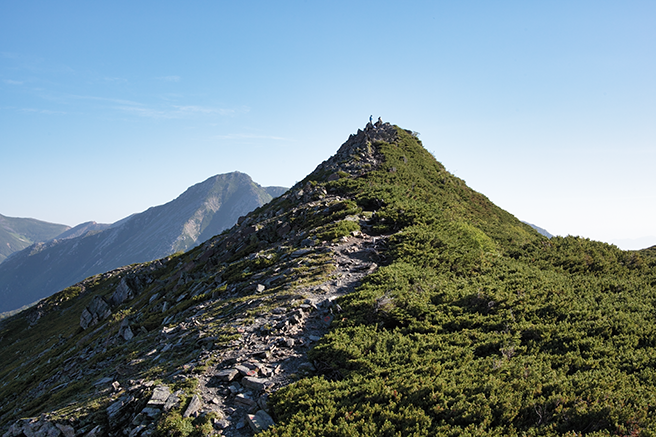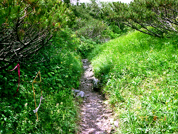 例の窪地から蝶ヶ岳山頂に向かう登山道。意外に急勾配で、しかも、アホほど滑りやすいのですよ。ある年は、カメラを持ったままこけてしまって、カメラのレンズの先っちょが一部凹みました。死刑。