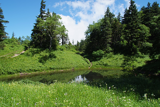 2007年に撮った「妖精の池」。ここは、恐らく「ルリボシヤンマ」と思われるヤンマと「蚊」の大孵化場でもあります。(ルリボリヤンマかどうかは、だんだん不安になってきました。あはは。)北アルプス蝶ヶ岳から徳沢方面に30分程度下った場所にあります。
