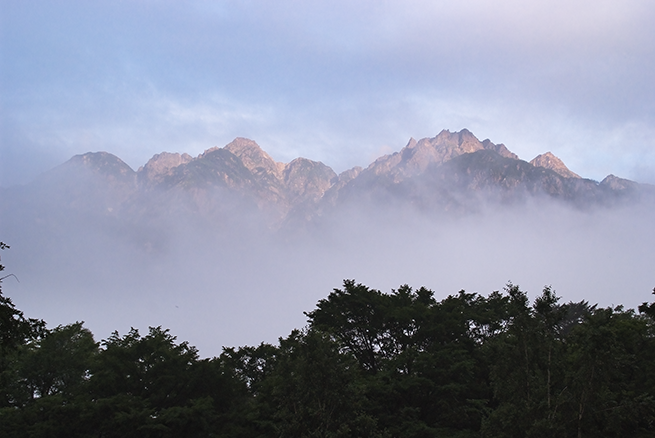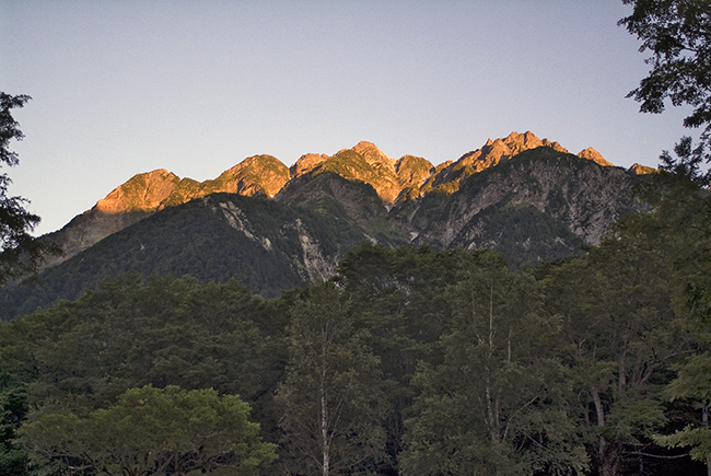 2006年8月、奥上高地の徳沢で撮りました。前穂高岳と明神岳の上部だけがモルゲンロートに染まっています。
