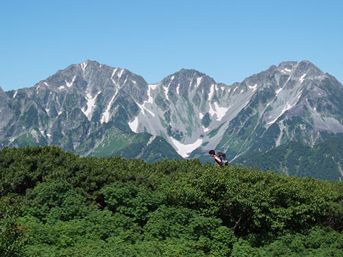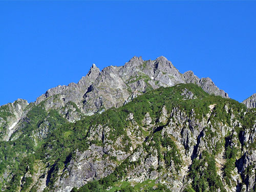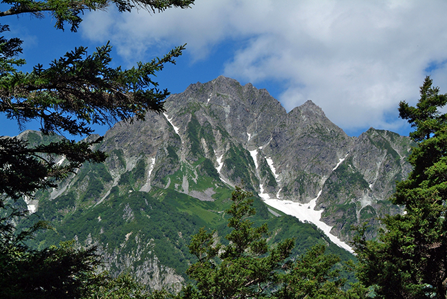 2006年8月、蝶ヶ岳登山に出発。登り初めて間もなく、木々の合間から、前穂高岳が大迫力で見えました。