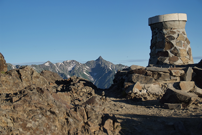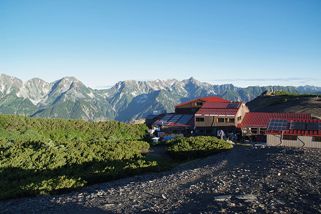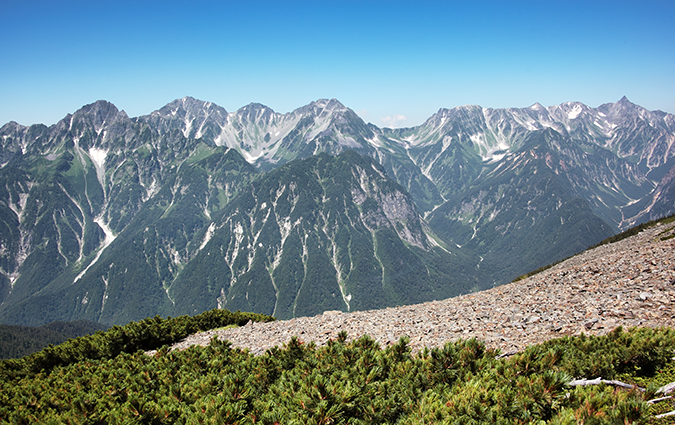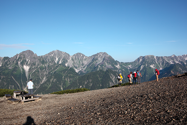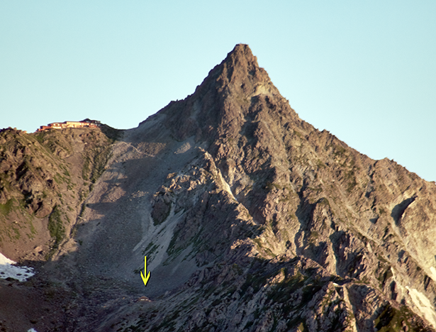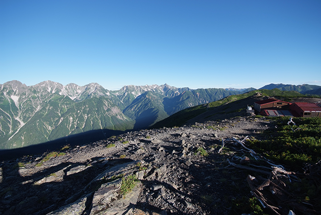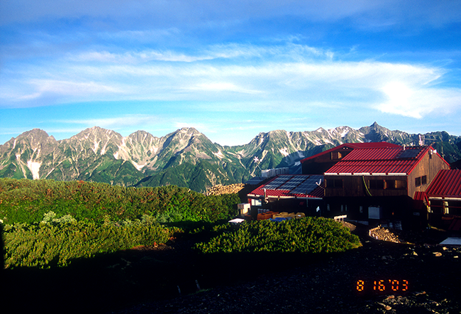 2009年8月、蝶ヶ岳ヒュッテの横から見た穂高連峰。