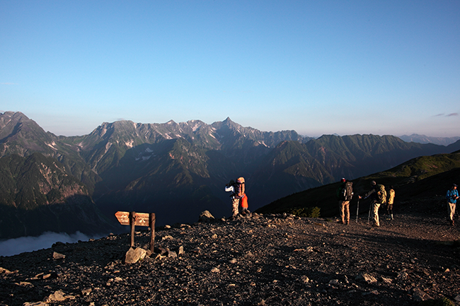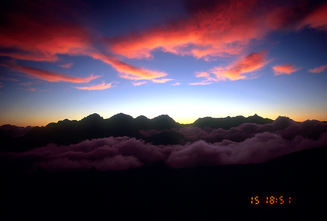 2001年。1978年と同じように、穂高の稜線とこちらの稜線の間に雲海が発生しました。つーことは、上高地、徳沢、横尾では、ドン曇りだなぁ。ほにょにょ。