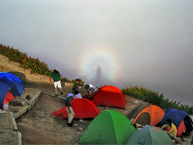 この現象を初めて見たのは、1980年12月上旬のことでした。望遠鏡のパーツを実家に撮りに行こうと、原チャリを2日間走らせました。(片道550km)その後、とりつかれたように、鳥取県の大山に登りました。約50cmの積雪で、初めは快晴でした。しかし、9合目辺りから天気が激変。そのちょっと前に、この「ブロッケンの妖怪」を見ました。丁度、下山してきた?ベテランのクライマーがいたので、教えてあげたら、その人も「初めて見た。」と、お礼に干し肉を頂きました。当時の大山山頂小屋は、とても古いものでした。トイレに行ったら、アンモニアの匂いで目がしみました。しかし、ヘッドライトに照らされて、細かい氷の結晶がキラキラキラと輝き、臭いのに、この世のものとは思えないほど綺麗だったことを思い出します。・・・しかし、軽い凍傷になってしまいました。