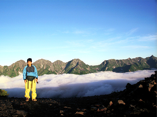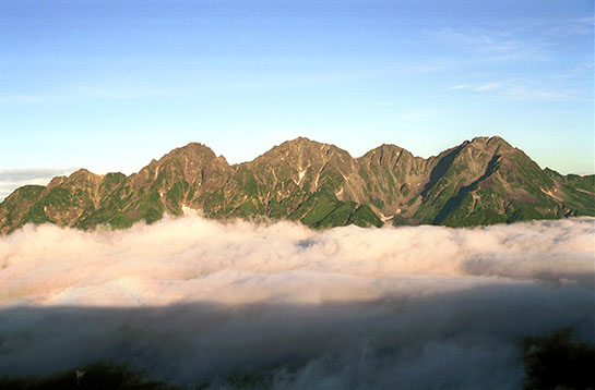 2001年に蝶ヶ岳で撮った雲海に浮かぶ穂高連峰です。うつくしー。