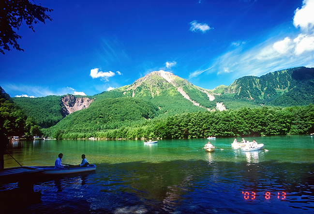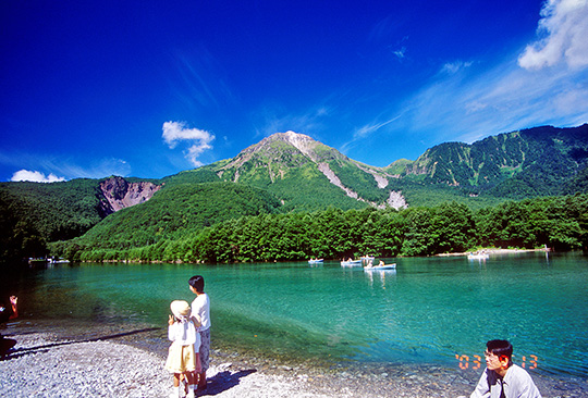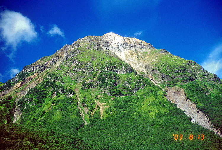 2003年8月 大正池から焼岳を撮ってみました。フィルムはベルビアでしたっけ?相当にコントラストと彩度が高いフィルムでした。