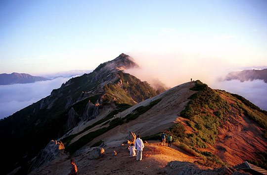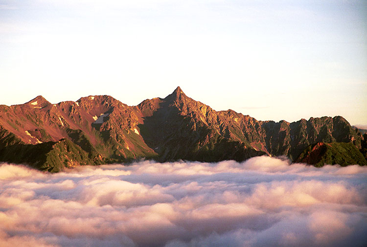 2001年8月に蝶ヶ岳から撮った雲海に浮かぶ槍ヶ岳とモルゲンロート。槍ヶ岳は、憧れの山ではありますが大渋滞は嫌ですねぇ。私は静かな山が好きなのですよ。