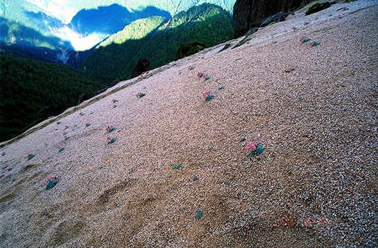 これまた2000年に撮った燕岳です。ここは、高山植物の女王と呼ばれる「コマクサ」の群生地でもあります。一時期は絶滅の危機もあったのだそうですが、保護活動のおかげでこの通りの群生です。