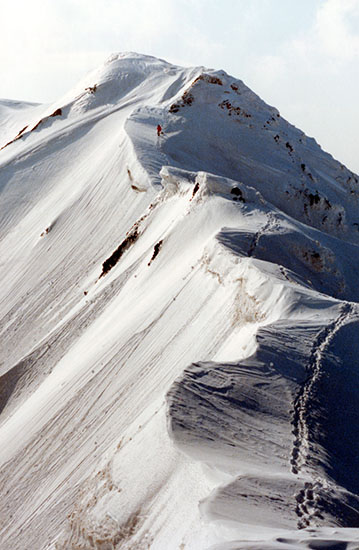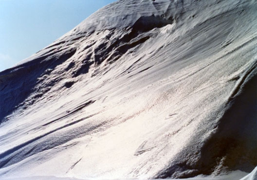 同じく1981年の大山縦走路です。さすがに3月ということで、温度が上がり雪が溶け始めています。確かこの日、北壁側の元谷(もとだに)で、雪崩で人が死んだとか聞いています。雪山はおそろしかー。上の方に小さく写っている赤い服の人がタチゲです。(ちなみに、縦走路は途中まで歩いただけです。縦走などすれば確実に死んでいます。)