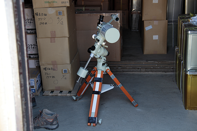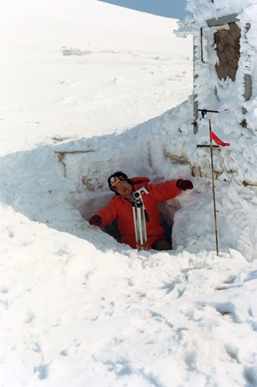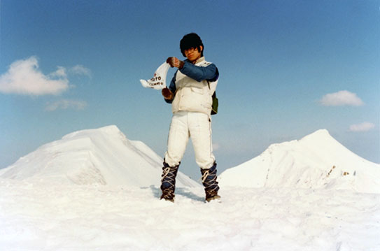 同じく1981年の3月のもの。温度が急激に上がり雪が急に溶け始めました。手に持っているのはお手製の「ヤマト天文同好会の旗」