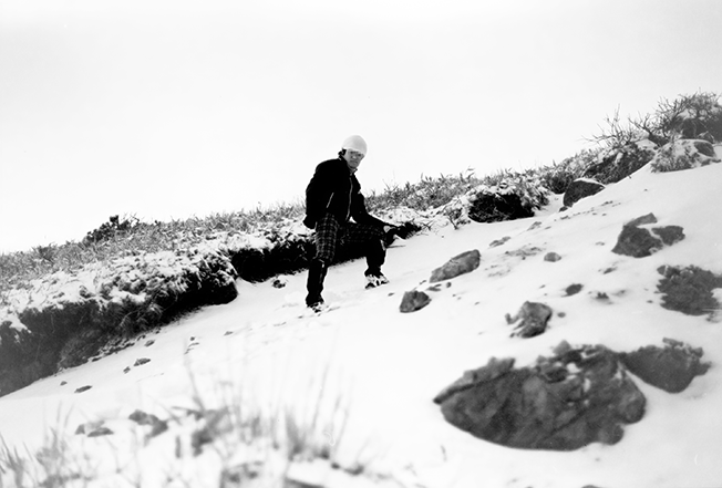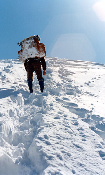 1981年3月に、鳥取県の大山登山を敢行。このナメナメと光る表面はキャンプ場付近からも見えていました。キスリングは約30kg。温度が高かったので、斜面の表面だけが薄く凍っている状態でした。アイゼンを踏み込むと、あっという間に薄い氷が砕けました。ちなみに、この写真はタチゲが撮ったものです。