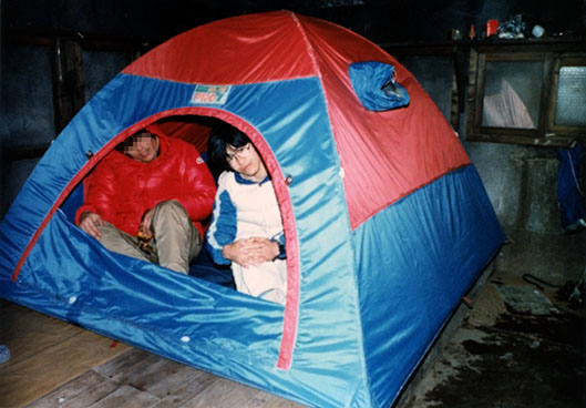 1980年の12月に大山を登った経験から、1981年3月には、小屋の中でテントを張るという方法を実行致しました。登山客は他にいたのかなぁ。多分いなかったような・・・ともあれ、雪にすっぽり埋まった小屋の中は真っ暗。当時、単三電池のヘッドライトしか持っていませんでしたので、電池の消費の早いこと、早いこと。