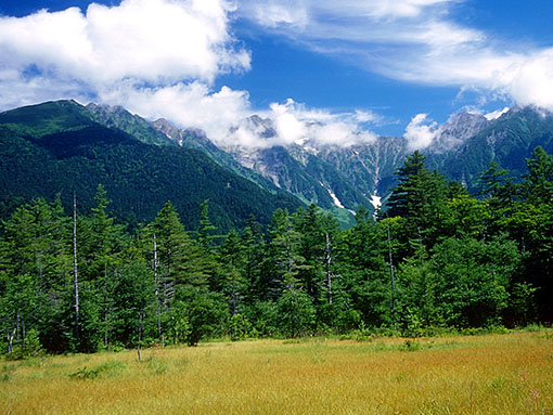 2003年8月。この時は、沢渡からタクシーに乗り大正池で降り、馬鹿でかいザックをかついで上高地バスターミナルまで歩きました。この写真は、田代池付近で撮ったものです。