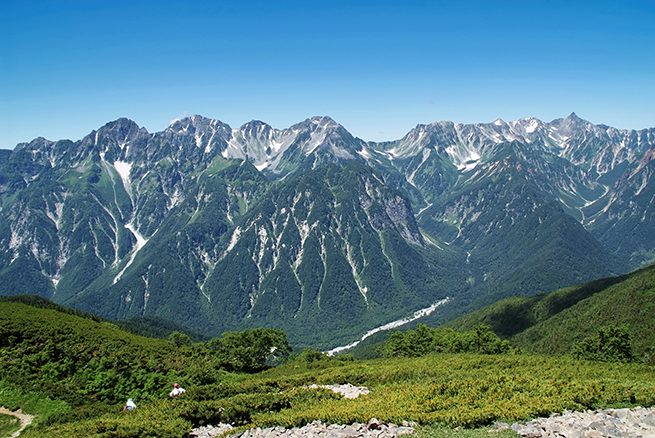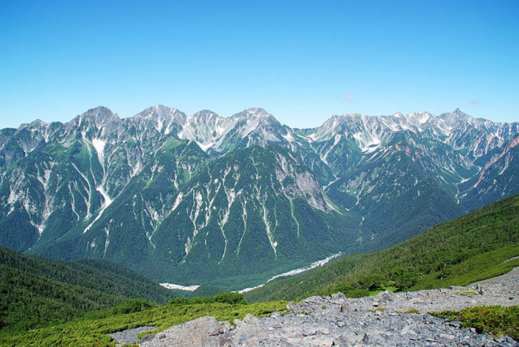 2007年8月撮影。登山道のある尾根から梓川、穂高連峰、槍ヶ岳を撮りました。鮮やかぁー。