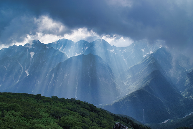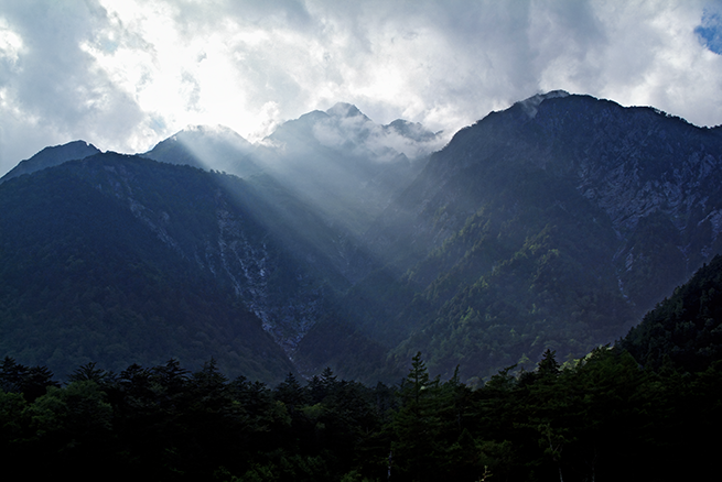 2007年に蝶ヶ岳から撮った穂高連峰にかかる「天使のハシゴ」。(写真を入れ換えました。)