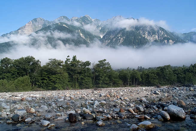 2006年に撮った河童橋近くからの風景。ここへ来る時間帯が悪いのか、意外に快晴の時がほとんどありませんでした。グラビアで見てから憧れていた風景です。最初にこの風景を見た時、「現実のもの」ではないような、そんな気がしていました。