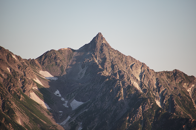 2001年、蝶ヶ岳から見たモルゲンロートに染まる「槍ヶ岳」。望遠使用。