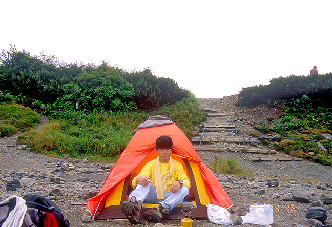 2001年の蝶ヶ岳のテン場。うーむ、この場所からだと、テン場は稜線のてっぺんにあるように見えますよねぇ。穂高と槍が見えています。
