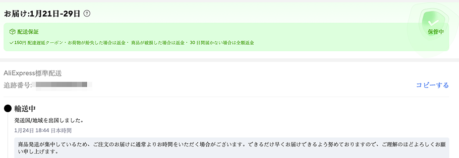 多分ですが、届くのは、29日の今日ではなく、明日か明後日になることでしょう。まずは、良かったわー。しかし、このシステム、全く理解が出来ていません。次回から「AliExpress」使うのをやめようかなぁって思っています。だって、怖いもんね。